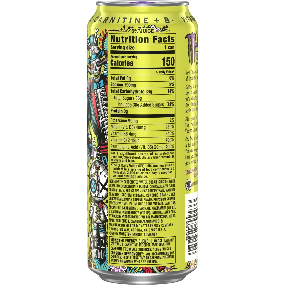 Step into the shadows and discover the mysterious power of Monster Energy Voodoo Grape. This unique variant has been developed to stimulate your senses with a rich, authentic grape flavour inspired by a blend of Concord, Niagara and red grape juices.