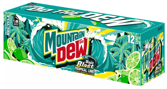 Only available for a limited time. Mountain Dew Baja Blast Tropical Lime is a Mountain Dew with a tropical lime flavor and a blue color.