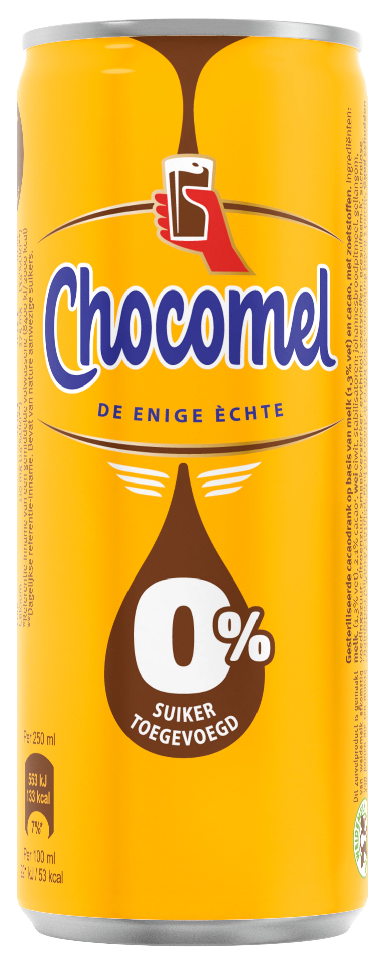 De vernieuwde receptuur van Chocomel 0% Suiker Toegevoegd bevat minder calorieën, waardoor genieten altijd mogelijk is, op een verantwoorde wijze. Nu met de smaak van de enige echte! Extra lekker uit blik.