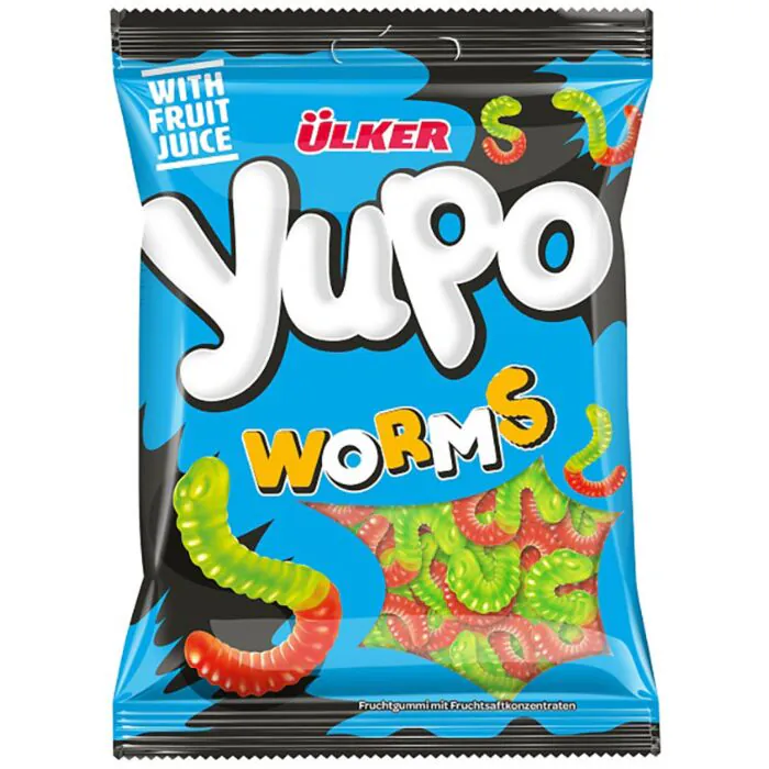 Met Ülker Yupo Worms geniet u van zachte jelly snoepjes in speelse wormvormpjes en met heerlijke fruitige smaken. De combinatie van een zachte, chewy textuur en zoete fruitsmaken zorgt voor een vrolijke en smakelijke snoepervaring bij elke hap. De kleurrijke wormpjes maken deze snoepjes extra leuk om te eten en perfect om te delen met vrienden en familie. Of u nu een filmavond heeft, een feestje organiseert of gewoon zin heeft in een zoete snack, Ülker Yupo Worms zorgen altijd voor een moment van genieten.