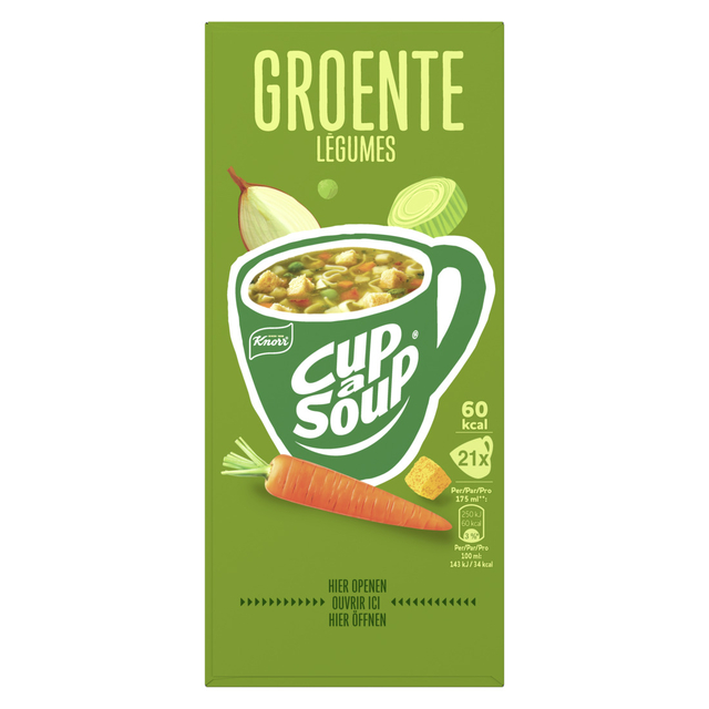 Do you fancy a nice soup? Or do you have a busy day and feel like a hearty snack to keep you sharp and alert? Then you are always in the right place at Cup-a-Soup! The Cup-a-Soup is easy and quick to prepare: put the contents of the bag in your favorite mug and pour 175 ml of boiling water. Then stir for a while, wait 1 minute and you’re done, enjoy! This way, you can prepare a delicious mug of soup in no time. At home, at the office or wherever you are, Knorr Cup-a-Soup is always a delicious savory snack.