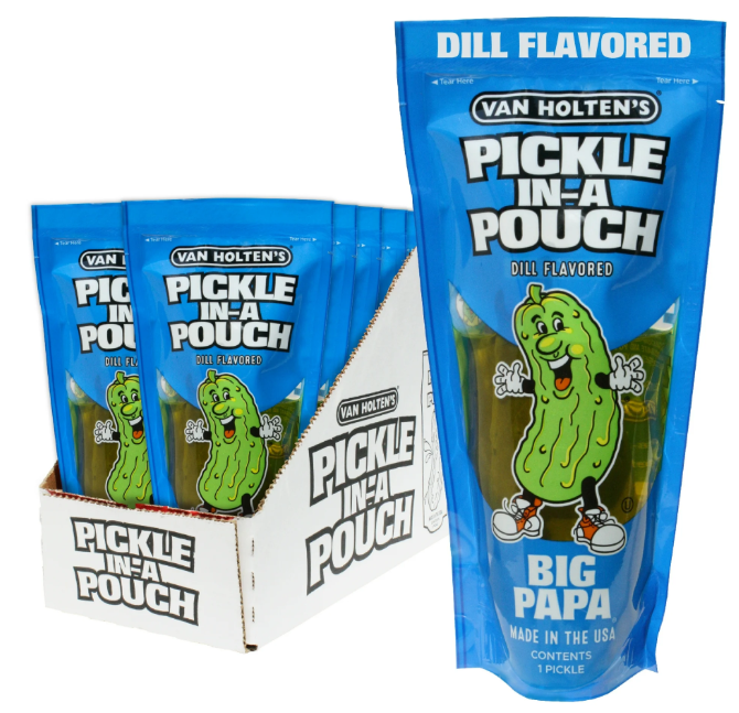 Van Holten’s Big Papa Pickle is een grote augurk met een zoete dille smaak, verpakt in azijnwater. Hierdoor blijft de augurk lekker sappig en behoudt het zijn smaak. Doordat u de augurken niet gekoeld hoeft te bewaren kunt u ze overal gemakkelijk mee heen nemen en is het een perfecte snack. Deze leider van de groep moet u geprobeerd hebben!