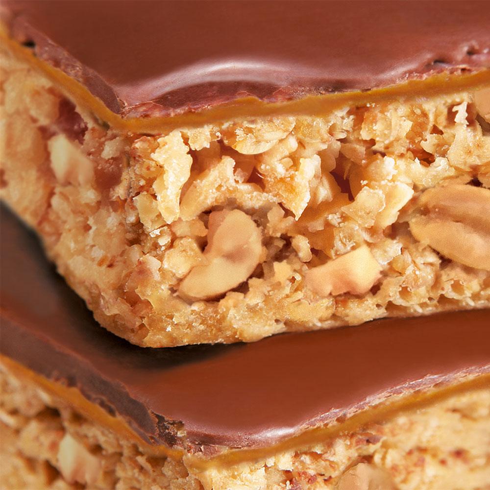 Ingrediënten: Havervlokken (33%), invertvloeibare suiker, karamel (16%) (gezoete gecondenseerde melk (Melk, suiker), glucosesiroop, suiker, plantaardige oliën (palmolie, koolzaadolie en palmkorrelolie), kleurstoffen: karamelkleur, water, emulgator: mono- en diglyceriden van vetzuren, zout, natuurlijke aroma’s), pinda’s (13%), plantaardige margarine (palmolie, koolzaadolie, water, emulgator: mono- en diglyceriden van vetzuren), cacaohoudende vetglazuur (9%) (suiker, palmolie, zoete weipoeder (Melk), tarwebloem, mager Cacaopoeder, emulgatoren: lecithines (soja) en polyglycerolpolyricinolaat, natuurlijke smaak.